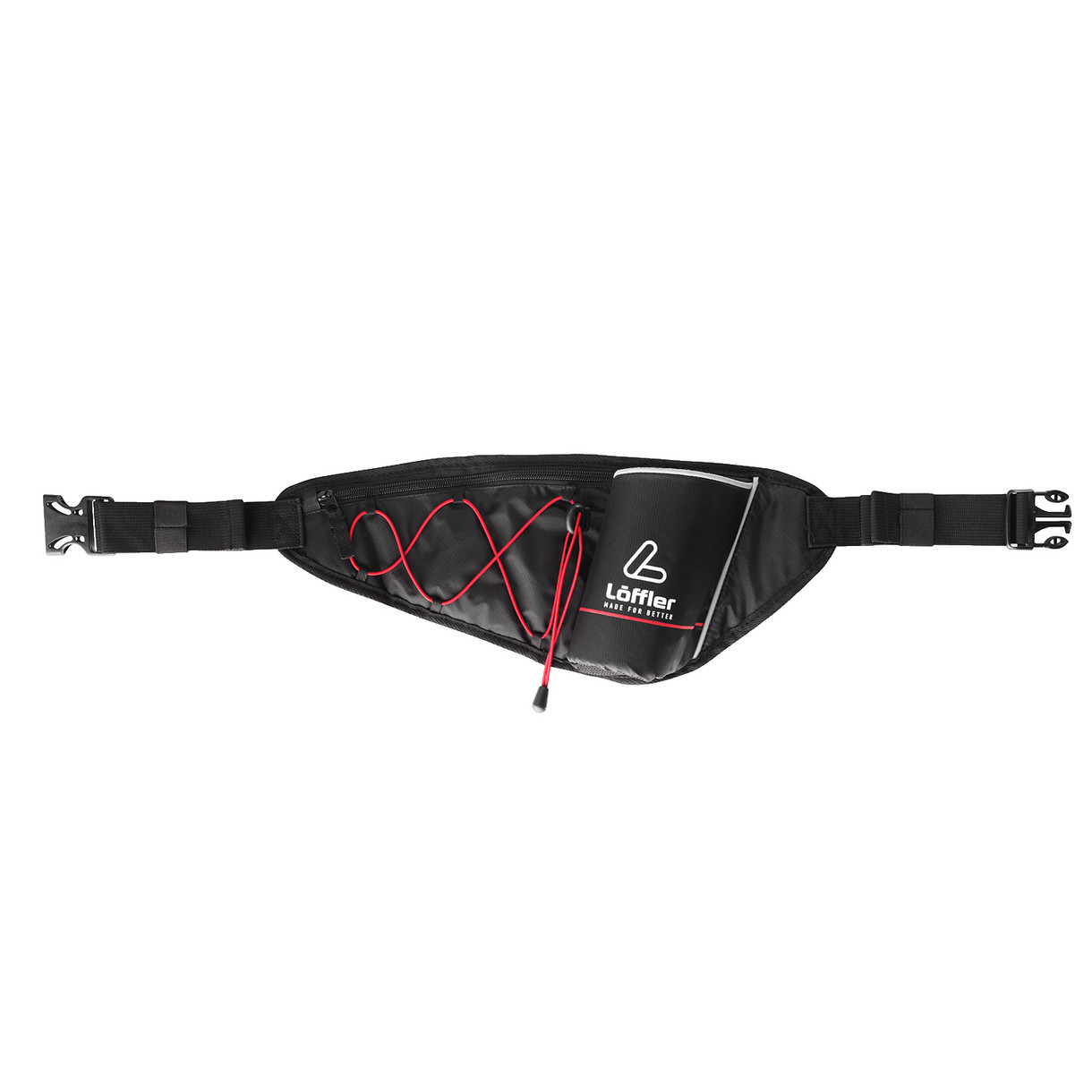 Weitenverstellbarer, gepolsteter Hüftgürtel mit Trinkflaschenhalter und großer Zip-Tasche, Klickverschluss, Reflektor.