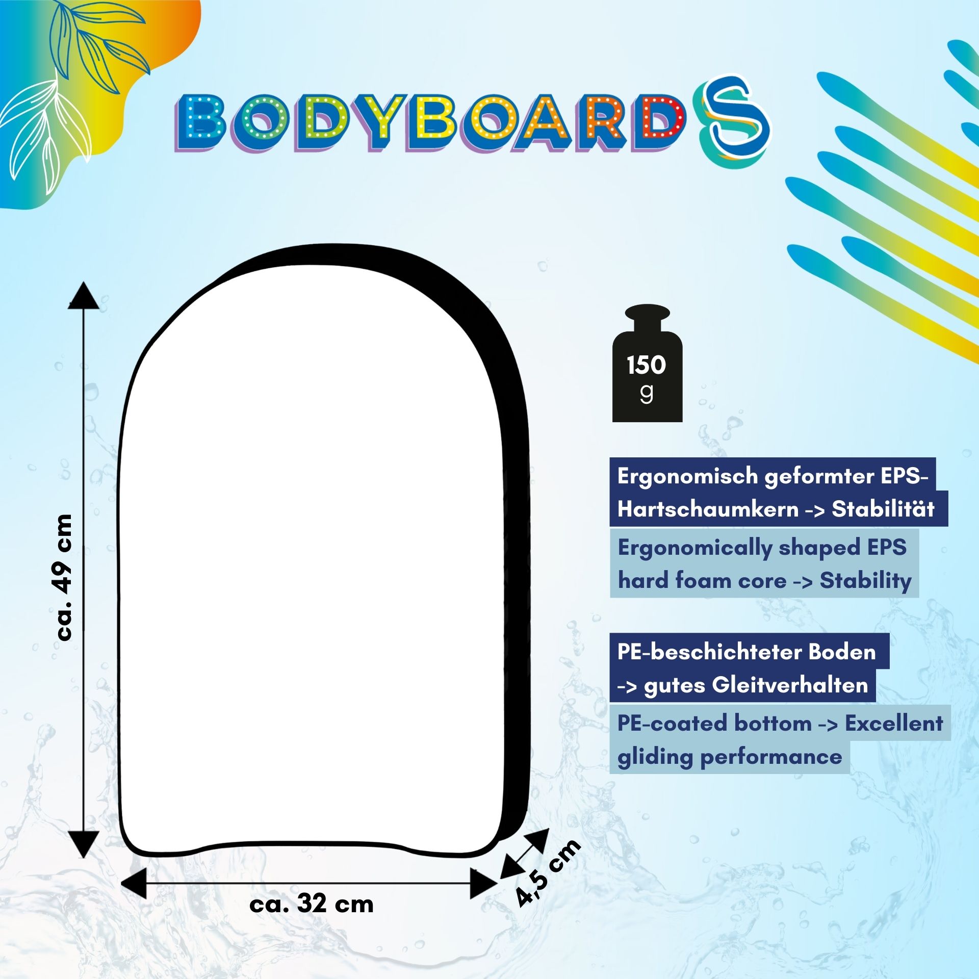 Bodyboards bieten den perfekten Einstieg in die Welt des Surfens. Das kleine Bodyboard S hat eine Größe von 49 x 32 x 4,5cm und ein Gewicht von 150g - optimal für heiße Sommertage. Es ist stromlinienförmig und Dank des EPS-Schaumstoff-Kerns mit Nylonüberzug besitzt es einen starken Auftrieb. Maximales Nutzergewicht: 60kg.