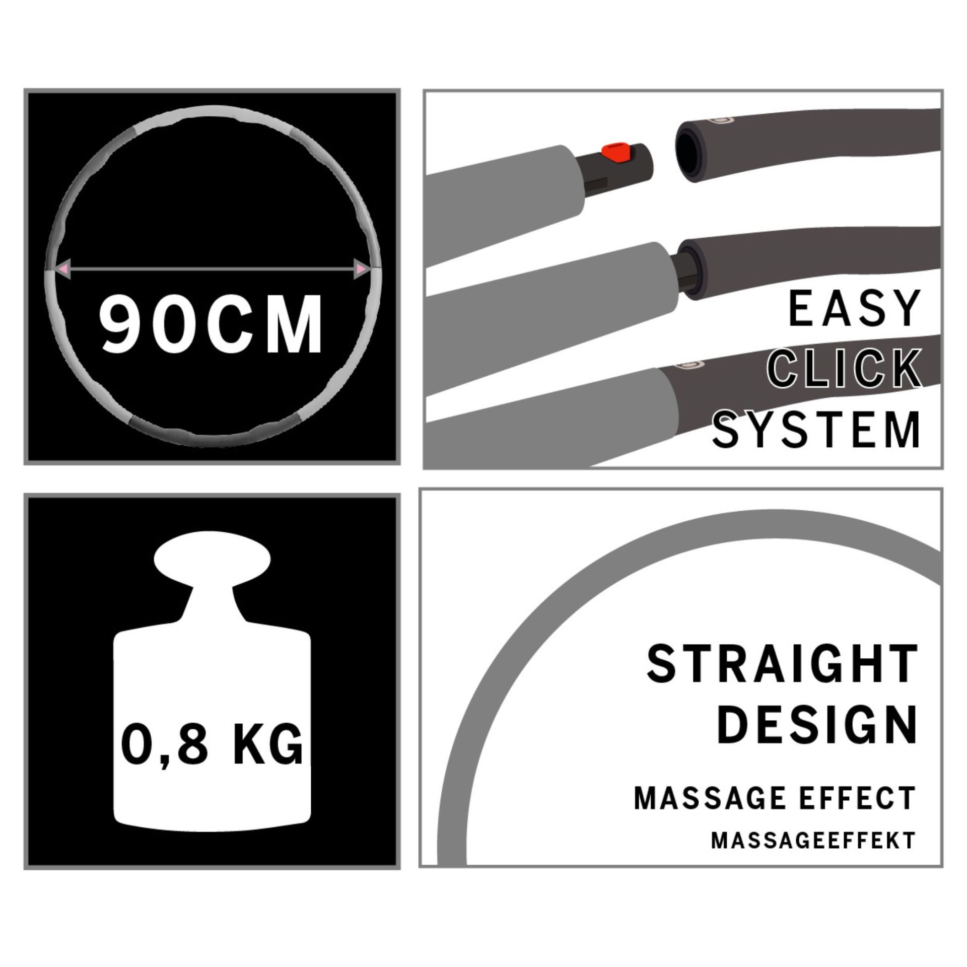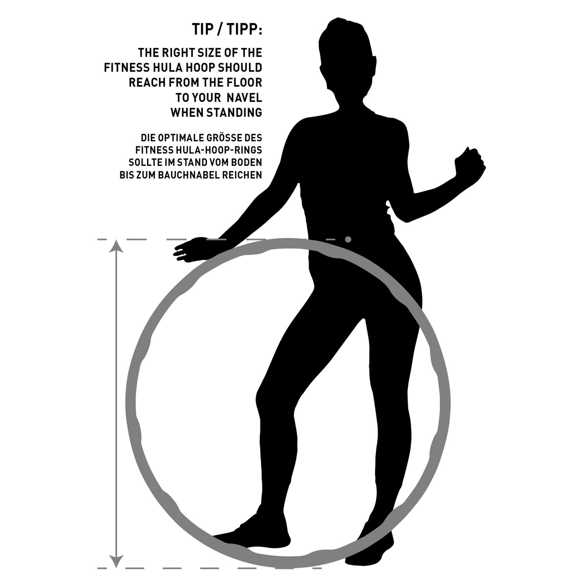 Das Hoop-Workout bewirkt neben dem Gewichtsverlust die Stärkung der Rücken- sowie Armmuskulatur, die Aktivierung von Bauch- und Gesäßmuskeln sowie die Straffung des Gewebes am Bauch. Der Fitness-Hoop (Durchmesser 90cm, Gewicht 0,8kg) kommt in sechs Einzelteilen, die sich durch ein einfaches Klicksystem zusammenstecken lassen. Durch sein geringeres Gewicht ist er das ideale Tool für den Einstieg in das Hoop-Workout. Die wellenartige Innenseite des Hoop-Reifens erzeugt dabei einen besonderen Massageeffekt, strafft das Bindegewebe und regt die Durchblutung an. Der Fitness-Hoop kräftigt außerdem Bauch- und Rückenmuskeln und macht eine schlanke Taille. Bei längeren Belastungen auch perfekt für das Herz-Kreislauf-Training.