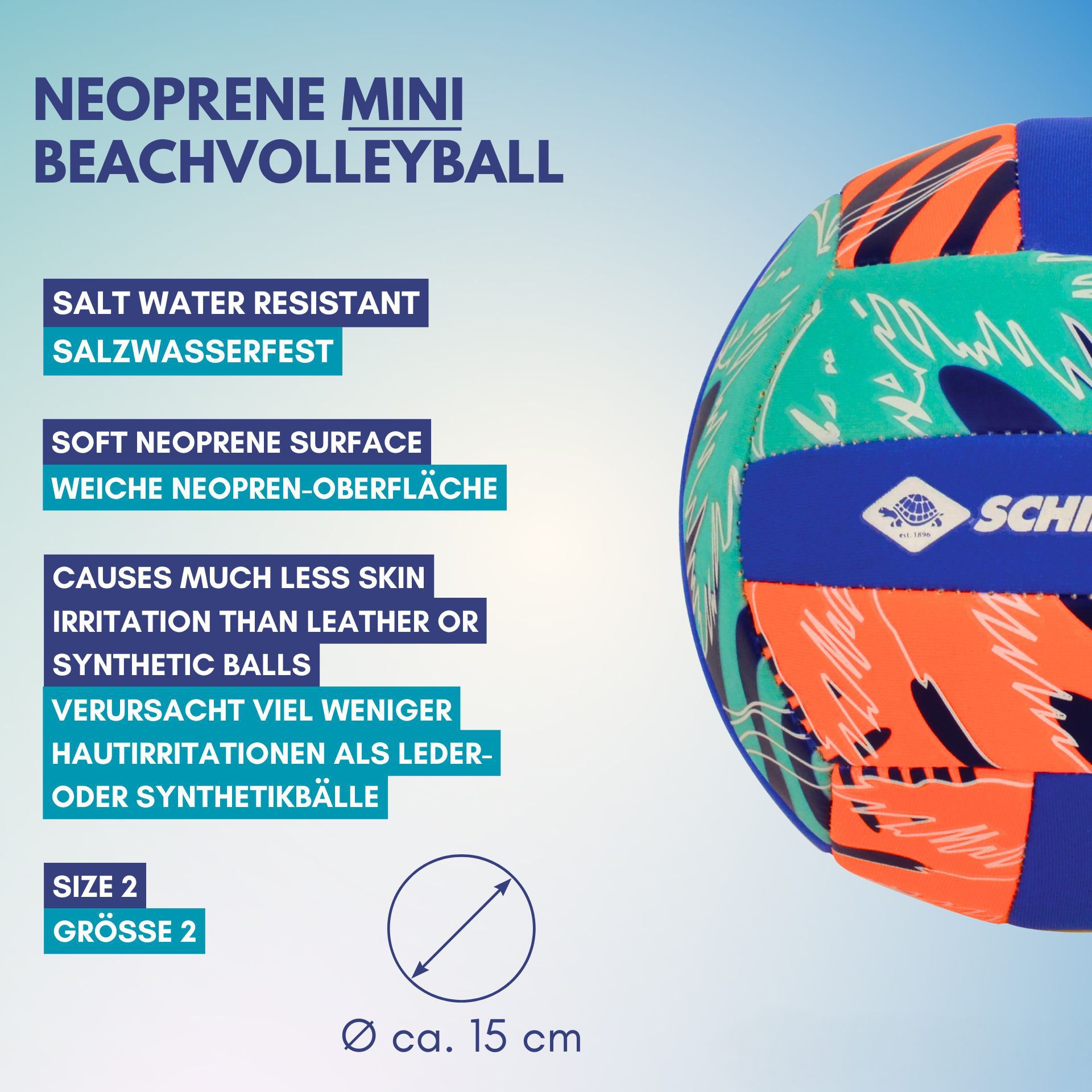 Der Schildkröt Neopren Mini Beachvolleyball (Größe 2, Ø 15 cm) überzeugt durch seine weiche, griffige Neopren-Oberfläche, die ein besonders angenehmes Spielgefühl bietet.